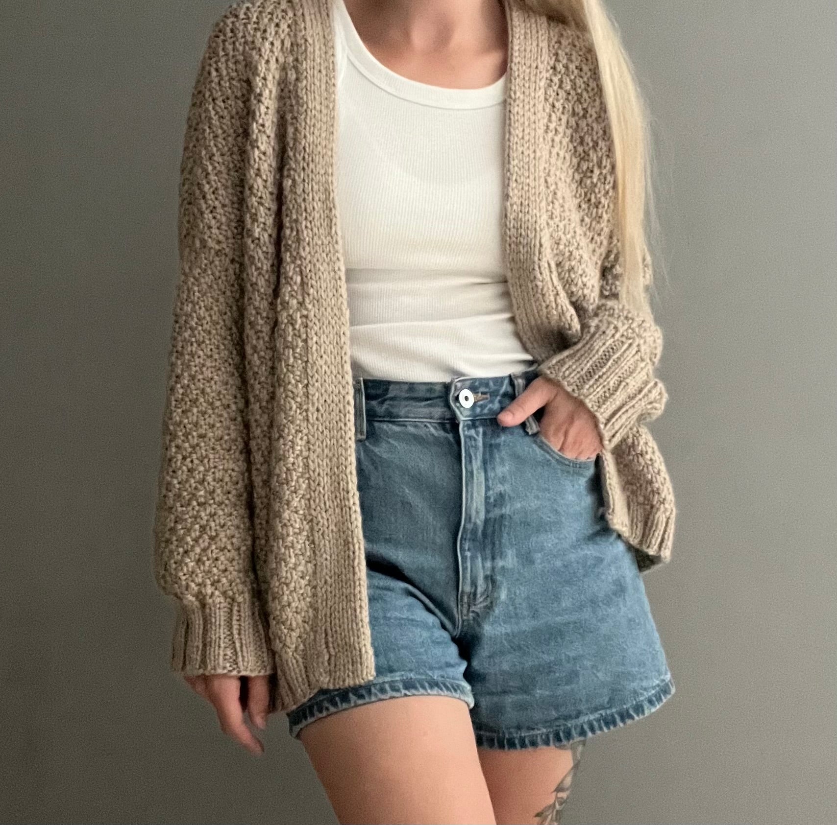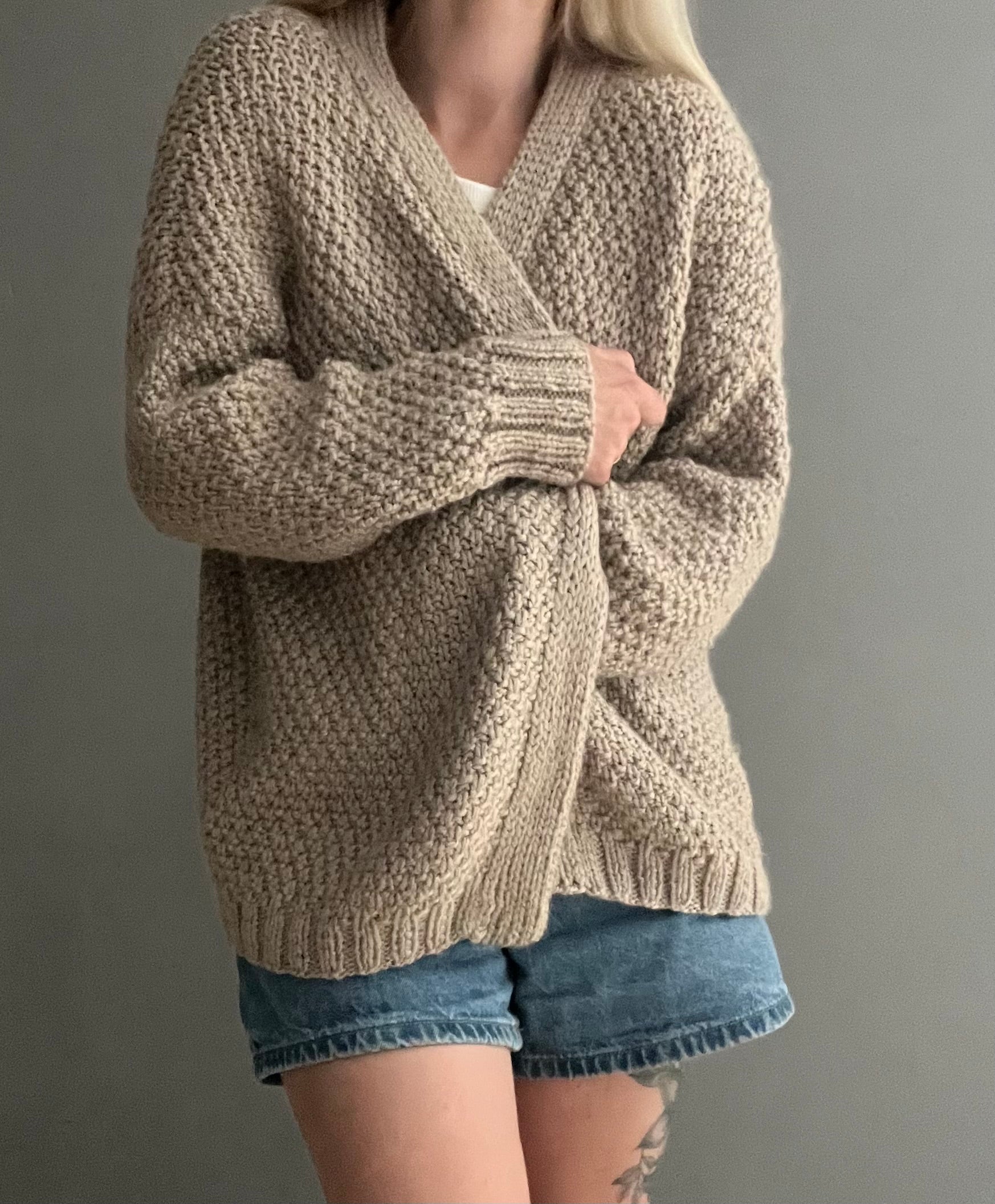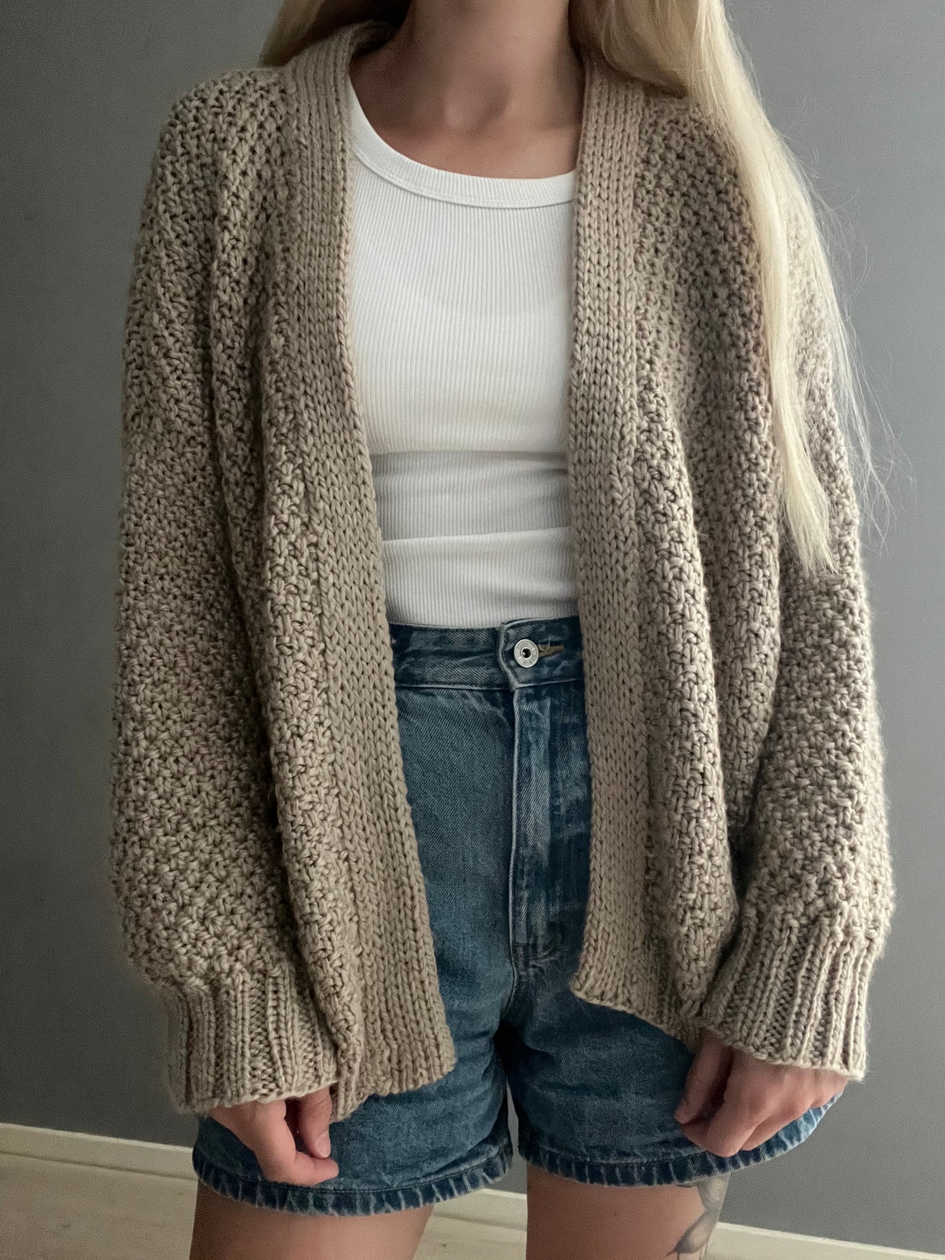 Jaka tiek adīta “pērļu” rakstā, adot no apakšas uz augšu rindās turp un atpakaļ.̧ Sāk adīt stāva daļu, pēc tam sadalot to 3 daļās – priekšpuses labā puse, priekšpuses kreisā puse un muguras daļa. Plecu vietas sašuj kopā, izmantojot trīs adatu noraukšanas metodi. Piedurknes pieada klāt un ada tās pa apli “pērļu” rakstā. Veido jakas apdari.