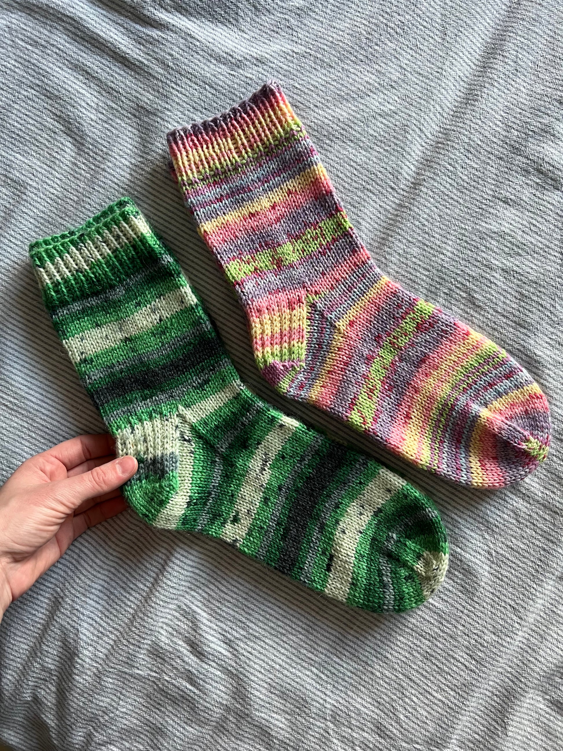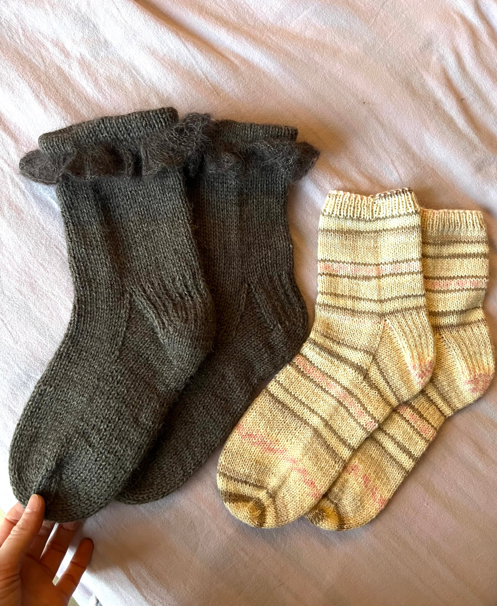 Plānās zeķes, kas ir paradzētas adīt no 4ply biezas dzijas un Vidēji biezās zeķes, kas tiek adītas no 6ply biezas dzijas.